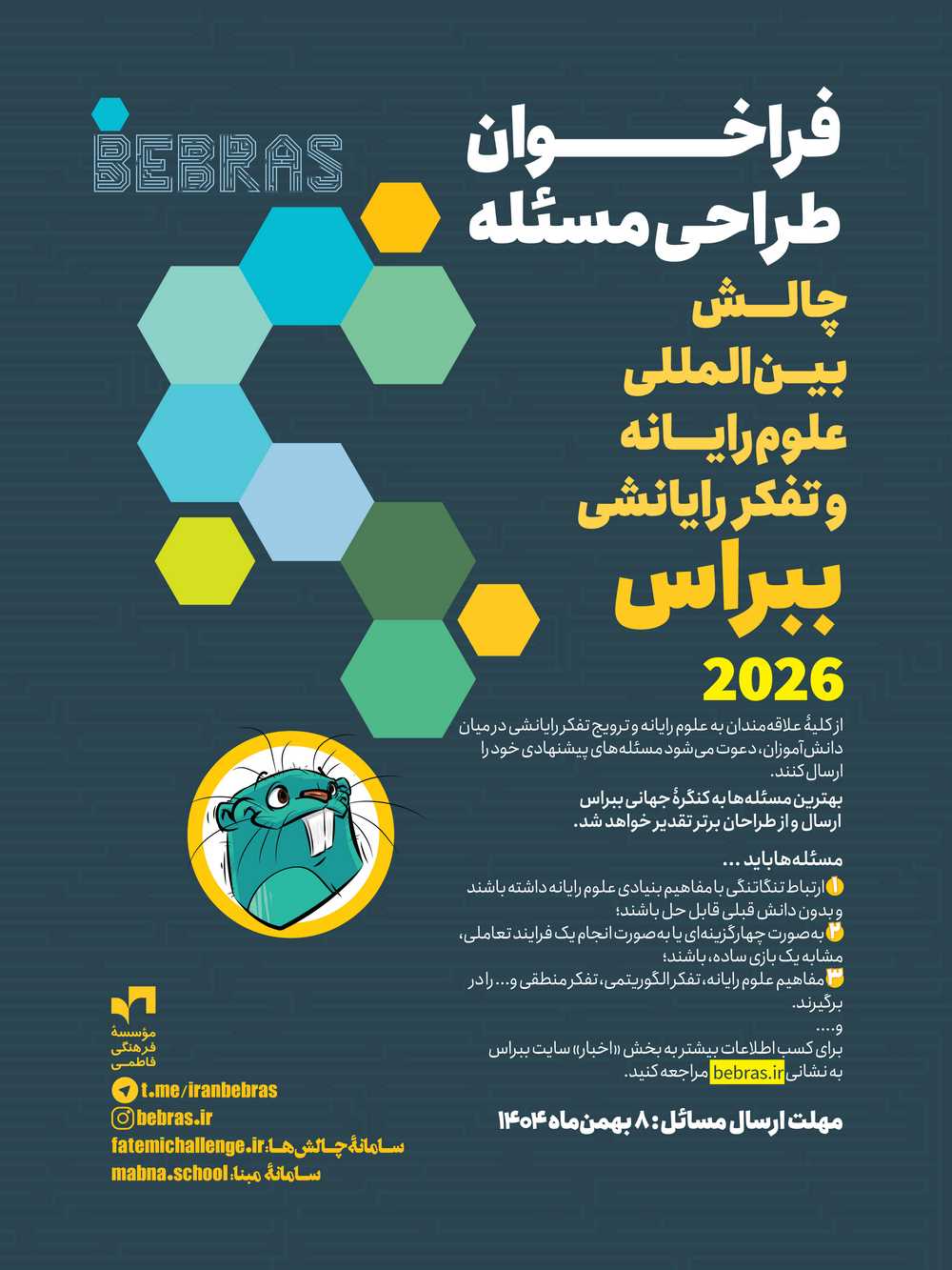 دبیرخانۀ علوم رایانۀ ببراس در ایران از همۀ معلمان، دانشجویان و سایر علاقهمندان دعوت میکند که مسئلههای پیشنهادی خود را حداکثر تا تاریخ ۸ بهمنماه ۱۴۰۴ به آدرس CTBebras@gmail.com ارسال کنند. بهترین مسئلهها به کنگرۀ جهانی ببراس که در اردیبهشتماه ۱۴۰۵ در کشور انگلستان برگزار میشود، ارسال خواهد شد.